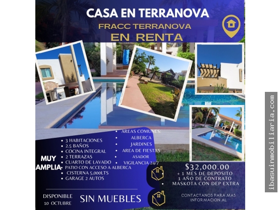 Precio de renta: $32,000.00 MXN + depósito de seguridad de la misma cantidad.
