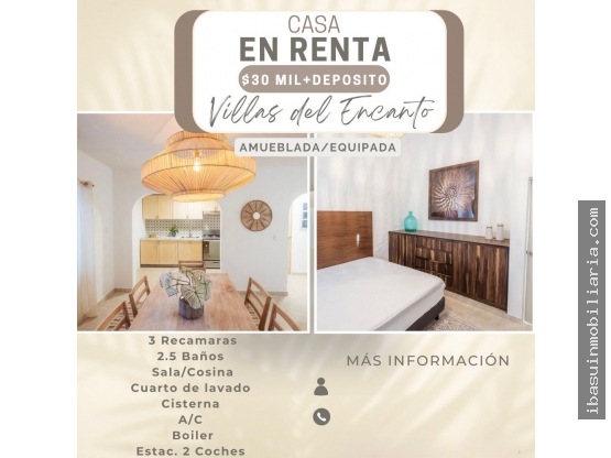 Pesos MexicanosCasa en Renta en Villas del Encanto, con opción de venta, ubicada en Cabo San Lucas, a unas cuadras del centro, amueblada y equipada, consta de 3 habitaciones, 2.5 baños, 4 mini splits, cisterna, boiler, cuarto de lavado y espacio en cochera para 2 autos.