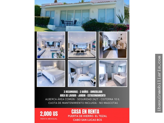 Dólares AmericanosCasa en Renta en Puerta de Hierro, El Tezal, Cabo San Lucas, amueblado, cuenta con 3 recámaras, 3 baños, área de lavado, alberca común, cisterna 10 Lts, jardin, estacionamiento y seguridad 24/7. No mascotas.